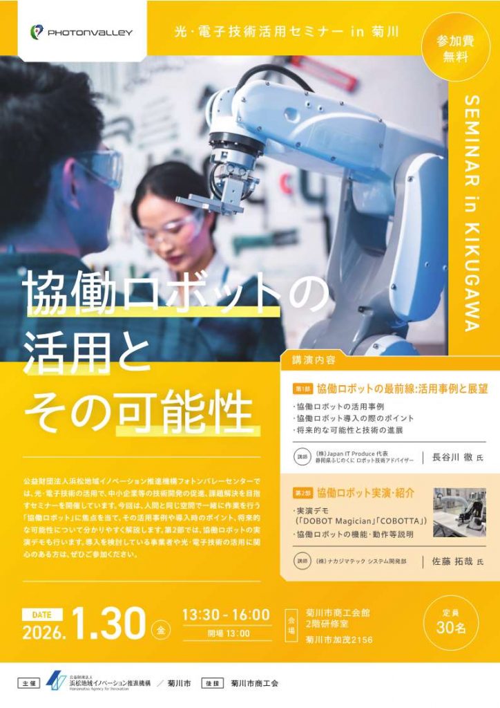 今回のセミナーは人間と同じ空間で一緒に作業を行う「協働ロボット」に焦点を当て、その活用事例や導入時のポイント、将来的な可能性について分かりやすく解説します。第2部では協働ロボットの実演も行います。