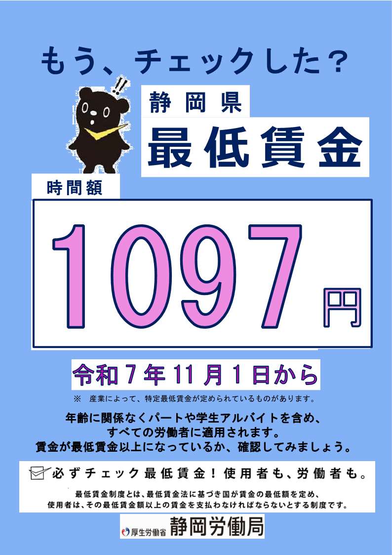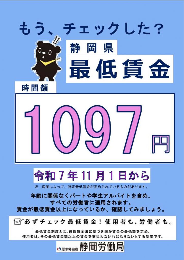 2025年10月2日令和7年度「静岡県最低賃金改正」のお知らせ