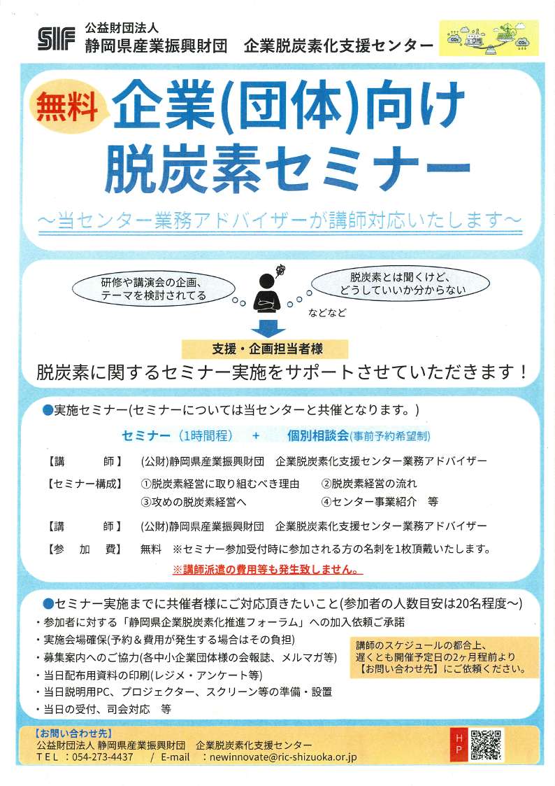 公益財団法人静岡県産業振興財団企業脱炭素化支援センターでは、企業・団体等の皆さま向けの脱炭素に関するセミナー実施のサポートを行っております。